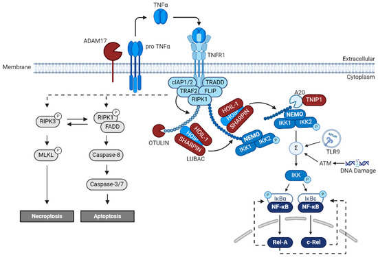 Overview of TNFR1-mediated activation of NF-κB dependent on linear ubiquitin. Membrane-bound TNF could be released by proteolytic cleavage mediated by ADAM17, resulting in intracellular signaling dependent on linear ubiquitin (small blue pearls). Activation of trimeric IKK complex could trigger nuclear localization of REL or RELA, which are controlled by feedback loops with IκBα or IκBε (modified from Sasaki et al., 2023 [53]). Alternatively, when ubiquitination of RIPK 1 is inhibited, interaction with FADD occurs, leading to activation of CASPASE-8-mediated cell death. In contrast, if CASPASE-8 is inhibited, RIPK3 interacts with MLKL, leading to necroptosis.