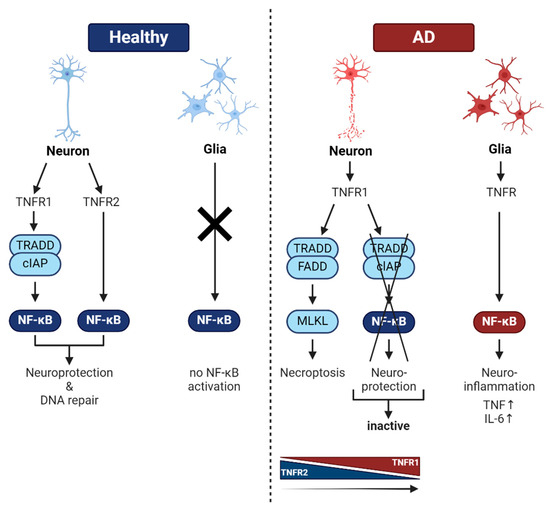 Summary of NF-κB function in healthy brain and AD. On the left side (in blue), the function of NF-κB in healthy neurons is depicted. Signaling through TNFR1 and 2 could lead to the expression of a neuroprotective gene program, inhibiting apoptosis as well as DNA repair. Glial cells do not contain activated NF-κB under healthy conditions. On the right side, NF-κB activity in AD is depicted (in red). Two main cell types are afflicted: neurons and glia. In contrast to healthy tissue, mainly TNFR1 is involved, without neuronal NF-κB activation, leading to neuronal death by necroptosis. In glial cells, a chronic inflammation is regulated by TNFR-mediated NF-κB activation, leading to high expression of proinflammatory cytokines TNF and IL-6. These could further exacerbate neuronal death.