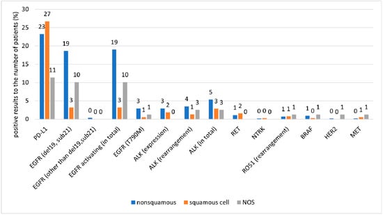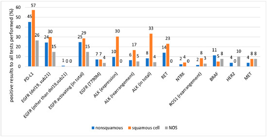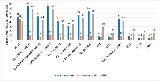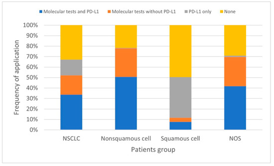 Our findings indicate that one-third of patients with NSCLC underwent both molecular and PD-L1 expression assays. In addition, 52% of patients underwent molecular testing either alone or in combination with PD-L1 assay. These proportions were higher in patients with non-squamous NSCLC and NOS (79% and 70%, respectively) than in those with squamous NSCLC. In advanced NSCLC, molecular tests were applied in 61% of all patients, 89% of those with non-squamous NSCLC, and 72% of those with NOS. While the higher frequency of using molecular tests in non-squamous NSCLC and NOS versus the entire group was observed for established mutations, the differences for emerging mutations such as RET, NTRK, BRAF, HER2, and MET were negligible (approx. 10% in both groups).