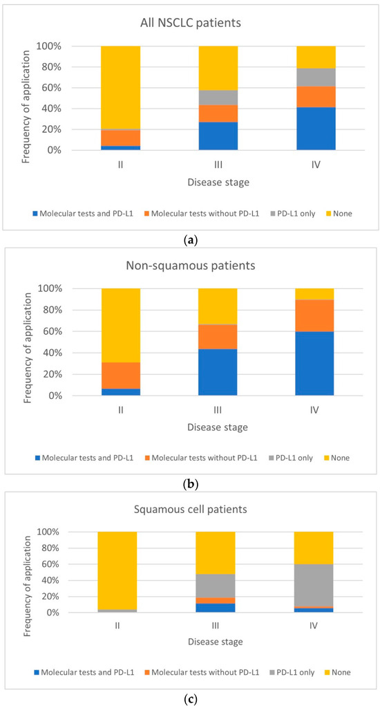 Frequency of molecular testing with disease stage in NSCLC patients and patient subgroups classified by cancer type: (a) All NSCLC patients, (b) Non-squamous patients, (c) Squamous cell patients, (d) NOS patients.