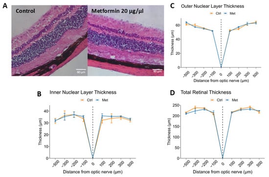 On microscopy, neither the metformin-treated nor control group presented with obvious morphological anomalies. H & E staining demonstrated that all retinal layers were present and well-defined (Figure 2A). Average thickness of the inner nuclear layer (INL) did not differ significantly between control and metformin-treated mice (31.1 ± 2.2 μm vs. 30.1 ± 2.2 μm, p = 0.773), nor did it differ individually at any of the locations analyzed (Figure 2B). Similarly, no differences were found between controls and metformin-treated mice with respect to outer nuclear layer (ONL) thickness (51.3 ± 2.8 μm vs. 51.4 ± 2.8 μm, p = 0.991), as well as total retinal thickness (TRT) (200.9 ± 14.1 μm vs. 197.5 ± 13.9 μm, p = 0.864) (Figure 2C,D).