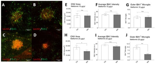 At the doses tested, IVT metformin did not significantly change signal intensity of IBA1 (Ionized calcium binding adaptor molecule 1) within the lesions (Figure 3F,I), a marker commonly used to generically identify macrophages/microglia of the innate immune system []. However, mice that received 0.5 µL of 20 µg/µL IVT metformin had fewer IBA1+ macrophages/microglia surrounding the CNV lesion compared to controls (4.48 vs. 9.70; p < 0.001) (Figure 3J). Between mice receiving 0.5 µL of 10 µg/µL IVT metformin and their controls, no differences were found in the quantity of IBA1+ macrophages/microglia surrounding the lesions (5.85 vs. 5.89; p = 0.485) (Figure 3G).