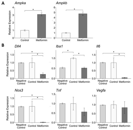 To better understand potential mechanisms by which IVT metformin treatment resulted in decreased CNV size and fewer surrounding IBA1+ macrophages/microglia, RPE/choroid gene transcription was measured 7 days after laser induction and IVT metformin injection. In particular, genes implicated in nAMD pathogenesis and CNV were selected for investigation. The average RPE/choroid gene expression in mice treated with 0.5 µL of 20 µg/µL IVT metformin was normalized to controls (n = 4 mice per group). Non-lasered mice (n = 6) were used as negative controls. We first tested whether this dose of IVT metformin induced transcriptional changes of one of metformin’s most well-characterized downstream targets, Ampk (Adenosine Monophosphate-activated Protein Kinase). Specifically, we found that IVT metformin increased expression of both the alpha (Ampka) and beta (Ampkb) subunits of the enzyme (Figure 4A). Next, we compared the expression of ten target genes: Dll4, Eglf7, Iba1, Il6, Nos3, Pgf, S100a8, Tie1, Tnf, and Vegfa (Figure 4B and Supplemental Figure S1). Among these genes, IVT metformin decreased RPE/choroid expression of Dll4 (Delta Like Canonical Notch Ligand 4), Iba1, Il6 (Interleukin 6), and Nos3 (Nitric Oxide Synthase 3). There were no statistically significant differences in expression of Egfl7, Pgf, S100a8, Tie1, Tnf, and Vegfa between the IVT metformin-treated mice and controls.