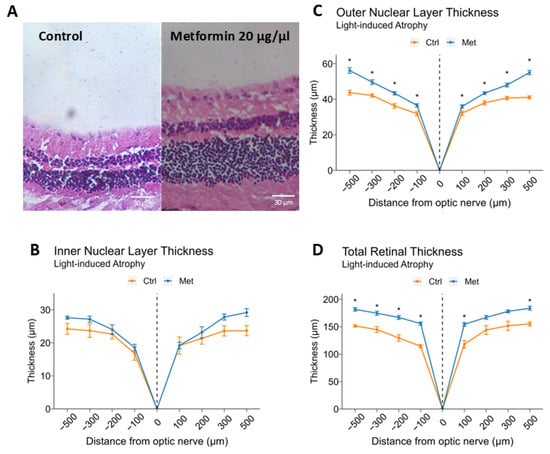 Intravitreal metformin treatment protects against light-induced retinal degeneration. Twelve-week-old, male BALB/cJ mice received 0.5 μL intravitreal (IVT) administration of either vehicle control (PBS) or metformin 20 μg/μL (total 10 μg) 6 h prior to dark adaptation. After 16 h of dark adaptation, mice were exposed to 2 h of light at an intensity of 7500 lux/hour (n = 5 per group). After 7 days, eyes were enucleated, cross-sectioned, and stained with hematoxylin and eosin. Representative 20×-magnified images of vertical cross-sections are shown (A). The inner nuclear layer (INL) (B), outer nuclear layer (ONL) (C), and total retinal thickness (TRT) (D) were measured at four locations around the optic nerve: 100, 200, 300, and 500 µm in opposite directions. Eyes receiving IVT metformin demonstrated thicker ONL and TRT compared to eyes receiving vehicle control. Data are presented as mean ± SEM. Statistical testing was performed using Student’s t-test for comparison; * p < 0.05.