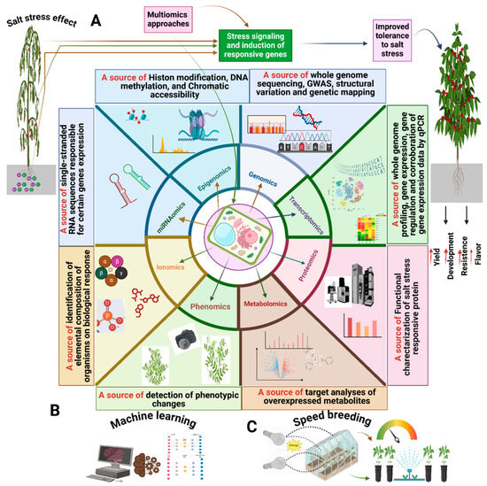 Figure 1. Salt stress affects lentil growth, but omics and other cutting-edge techniques help improve salt tolerance and develop saline-smart cultivars. (A) Salt stress from different sources in different forms affects lentil crops and reduces their growth, development, resistance, and flavor. Single omics or integrated omics, which involve combining two or more approaches, can be used in studies under salt stress alone or in combination with other stress conditions and plant tissues. These omics approach(es) produce comprehensive datasets that can be beneficial in developing saline-smart lentils. (B) Machine learning analyzes these datasets to determine how plants react to salt stress and to identify important components such as genes, metabolites, proteins, and markers. (C) Speed breeding facilitates the rapid introgression of salt-smart traits by accelerating breeding cycles. (AC) Omics, machine learning, and speed breeding facilitate the development of saline-smart lentil cultivars. Created with BioRender.com.