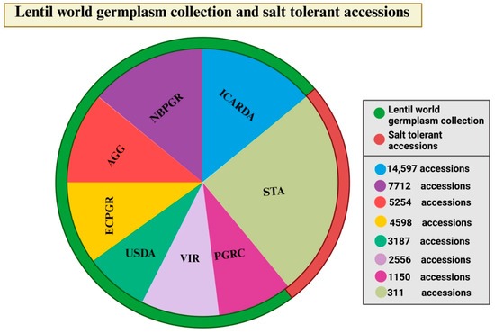 Figure 3. Lentil germplasm is collected and preserved around the world. ICARDA = International Center for Agricultural Research in the Dry Areas, NBPGR = National Bureau of Plant Genetic Resources, AGG = Australian Grains Genebank, ECPGR = European Cooperative Programme for Plant Genetic Resources, USDA = United States Department of Agriculture, VIR = the Vavilov Institute of Plant Genetic Resources, PGRC = Plant Gene Resources of Canada. STA = Salt-tolerant accessions. Created with BioRender.com.