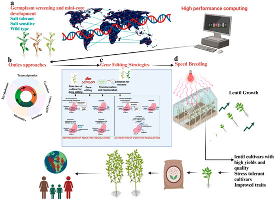Improving lentil productivity in the face of changing climatic conditions requires an understanding of how lentils respond to, adjust to, and endure salinity changes [4]. Novel ideas for breeding saline-smart lentils can be obtained by examining how lentils have evolved to withstand stress and developed survival strategies to mitigate the adverse impacts of salinity stress. Plants have an innate ability to control their own growth and development in response to both internal and external stimuli [5]. Many biotechnological approaches have been used in recent years to gain an understanding of the pathways and mechanisms underlying plant tolerance and responses to salt stress. Omics approaches (e.g., transcriptomics, proteomics, metabolomics, miRNAomics, phenomics, and ionomics) at the tissue or single-cell levels have become state-of-the-art techniques that could promote the improvement of lentils and help ensure global food security [6] (Figure 1). These cutting-edge omics techniques are essential to saline-smart breeding initiatives because they provide new understandings of the genetic, molecular, and physiological factors influencing plant responses to salt stress. These methods assist in developing saline-smart lentils with improved tolerance and yield, supporting sustainable agriculture, and addressing issues related to global food security by deciphering intricate molecular processes [7].