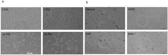 Microphotographs of dermal fibroblasts in the process of transdifferentiation in the neuronal direction (A) and after the application of short peptides (B). (A) Images illustrating changes in the morphology of induced neurons derived from dermal fibroblast lines of elderly donors at 0 days in vitro (DIV), 7 DIV, 14 DIV, and 28 DIV. Light microscopy, ×10. Scale bars correspond to 100 µm. (B) Images illustrating morphology of induced excitatory neurons at 38 DIV after application of short peptides AEDG, EDR, and KED. Light microscopy, ×10. Scale bars correspond to 100 µm. PID—post-infection day. EDR—Glu-Asp-Arg, KED—Lys-Glu-Asp, AEDG—Ala-Glu-Asp-Gl.