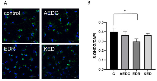 DNA damage is a well-known mediator of cellular senescence in mitotic cells, mainly due to replication errors and the influence of factors such as oncogenic and oxidative stress [23]. Among more than 30 different base modifications and other types of oxidative DNA damage, the most common is 8-hydroxydeoxyguanosine (8-OHdG), which leads to mutations through the formation of GC-TA transversions [24]. To evaluate if short peptides protect induced neurons from oxidative DNA damage, we measured the 8-OHdG level. The relative value of the fluorescent staining intensity of 8-OHdG divided by the signal from DAPI in the control group of induced neurons obtained from the fibroblasts of elderly donors in the absence of peptides was 0.40 ± 0.04 relative units. After the addition of the AEDG peptide, the level slightly decreased by 10% to 0.36 ± 0.04; after the addition of the EDR peptide, it statistically significantly decreased by 23% to 0.31 ± 0.03; and after the addition of the KED peptide, it decreased by 15% to 0.34 ± 0.03. Based on the obtained results, it can be concluded that the effect of the EDR peptide with a value very close to significant (p = 0.0566) contributes to the reduction of oxidative damage to DNA in cells during aging (Figure 2A,B).