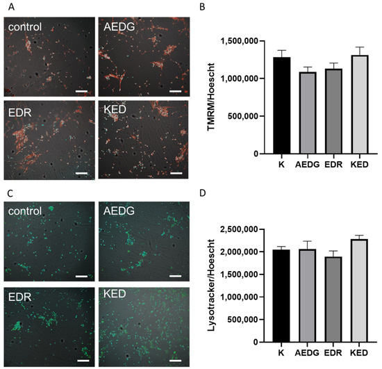 Neuronal cells require a large amount of energy; thus, mitochondrial malfunction is considered a serious factor in neuronal dysfunction. Cellular aging also involves not only mitochondrial impairment but also a marked deterioration in proteostasis, which is the cellular network that governs protein life from synthesis to degradation [25]. In neurodegenerative diseases, which typically involve widespread neuronal cell death, affected neurons also show an increase in dysfunctional lysosomes [26]. Thus, we access the functional activity of mitochondria and lysosomes in induced neurons obtained from aged donors. The ratio of the relative fluorescence intensity of the TMRM signal divided by the number of cell nuclei detected by the fluorescent dye in induced neurons was 1,282,919 ± 92,318 relative units in the control. After the application of the AEDG peptide, it slightly decreased by 16% to 1,086,801 ± 65,835 relative units; after the application of the EDR peptide, it slightly decreased by 12% to 1,130,588 ± 75,002 relative units; and after the application of the KED peptide, it remained virtually unchanged and was 1,313,458 ± 104,593 (Figure 3A,B). A similar analysis was performed to investigate the lysosomal activity in induced neurons. In the absence of peptides, the lysotracker fluorescence intensity value was 2,046,932 ± 71,737. After the application of the AEDG peptide, the fluorescence intensity remained unchanged and was 2,060,850 ± 175,204; after the application of the EDR peptide, it decreased by 8% to 1,895,572 ± 123,632; and after the application of the KED peptide, it decreased slightly by 11% to 2,282,061 ± 82,881 (Figure 3C,D). Thus, as in the case of mitochondria, statistically significant differences in the effect of peptides on lysosome activity were not revealed.