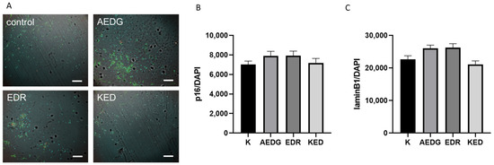 Microphotographs illustrating the analysis of p16 and laminB1 levels in induced neurons after application of short peptides. (A) Immunofluorescent staining of induced neurons with antibodies to laminB1 (secondary antibodies Alexa 488, green), p16 (secondary antibodies Alexa 555, red), and nuclei visualization with DAPI (blue) dye in the control cells and cells treated with short peptides AEDG, EDR, and KED. Scanning confocal microscopy, ×10. Scale bar 200 um. Histogram illustrating the level of p16 protein (B) and lamin B1 protein (C) expression in induced neurons derived from dermal fibroblast lines of elderly donors. Data are presented as mean ± SEM.