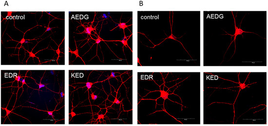 Our previous studies have demonstrated EDR and KED’s neuroprotective properties in cellular and mouse models of Alzheimer’s disease [15,16]. In addition, there is evidence of the effect of these peptides on apoptosis in neurons under conditions of cellular stress. The stimulating effect of EDR and AEDG peptides on the short-term and long-term memory of bees also has been previously demonstrated [17]. In a study of the effect of peptides on the neuronal differentiation of human periodontal ligament stem cells (hPDLSCs), it was shown that the AEDG peptide positively affects neurogenic differentiation gene expression and protein synthesis in human gingival mesenchymal stem cells [18]. Moreover, peptides AEDG and KED prevented cellular senescence in hPDLSCs during long-term cell cultivation detected by p16 and p21 markers [19].