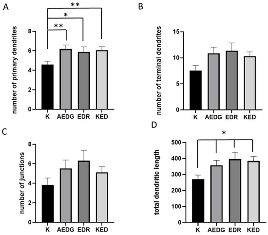 The obtained analysis demonstrated (Figure 6) that the number of primary processes in induced neurons in the control was 4.59 ± 0.3. After the application of the AEDG peptide, a statistically significant increase in the number of processes by 34% to 6.18 ± 0.4 (p = 0.0046) is observed; after the application of the EDR peptide, a statistically significant increase in the number of processes to 5.87 ± 0.5 (p = 0.0208) is also observed, which is 28%; and after the application of the KED peptide, a statistically significant increase by 32% to 6.06 ± 0.3 (p = 0.0093) is observed. Next, the number of branching points was analyzed. In the control group, it was 3.82 ± 0.7. After the application of the AEDG peptide, a slight increase in the number of branching points by 44% to 5.53 ± 0.8 is observed; after the application of the EDR peptide, a slight increase in branching points to 6.31 ± 1.0 is also observed, which is 65%; and after the application of the KED peptide, an insignificant increase of 34% to 5.12 ± 0.6 is observed. Then, the number of terminal processes was analyzed; in the control, the value of this parameter was 7.53 ± 1.0. After the application of the AEDG peptide, a statistically insignificant increase in the number of processes by 44% to 10.88 ± 1.2 is observed; after the application of the EDR peptide, a statistically insignificant increase in the number of processes to 11.38 ± 1.2 is also observed, which is 51%; and after the application of the KED peptide, a statistically insignificant increase of 37% to 10.31 ± 0.8 is observed. Finally, the total length of all processes was analyzed. In the control, its value was 270.2 ± 25.5. After the application of the AEDG peptide, a statistically significant increase in the number of processes by 32% to 357.8 ± 30 (p = 0.05) is observed; after the application of the EDR peptide, a statistically significant increase in the number of processes to 395.9 ± 43 is also observed, which is 46% (p = 0.0332); and after the application of the KED peptide, a statistically significant increase of 42% to 384 ± 27 (p = 0.0148) is observed. Thus, it can be concluded that all the studied peptide bioregulators, AEDG, EDR, and KED, are able to positively influence the morphological structure of the dendritic tree of induced neurons due to the formation of primary dendrites, increasing their number by 34%, 28%, and 32%, respectively, and also contribute to an increase in the total length of dendrites by 32%, 46%, and 42%, respectively.