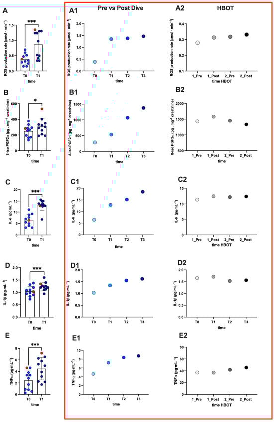 Panel plots of the oxy-inflammation biomarkers in divers and the evolution of concentration in the DCS-affected subject. Histogram plot of (A) salivary ROS production rate, (B) urinary lipid peroxidation (8-isoPGF2α), and salivary (C) IL-6, (D) IL-1β, and (E) TNF-α levels in all divers pre- and post-immersion. The red dot indicates the subject of the DCS case. Statistically significant differences comparisons are displayed as follows: *, p < 0.05; and ***, p < 0.001. At the right panel, inside the red box, the time course of (A1,A2) ROS production rate, (B1,B2) lipid peroxidation, (C1,C2) IL-6, (D1,D2) IL-1β, and (E1,E2) TNF-α levels from T0 to T3 in saliva (T0: 30 min before the dive; T1: 30 min after surfacing and DCS symptom onset; T2: 3 h after DCS symptom onset; T3: 6 h after DCS symptom onset) and plasmatic values for the two HBOT sessions in the injured subject.