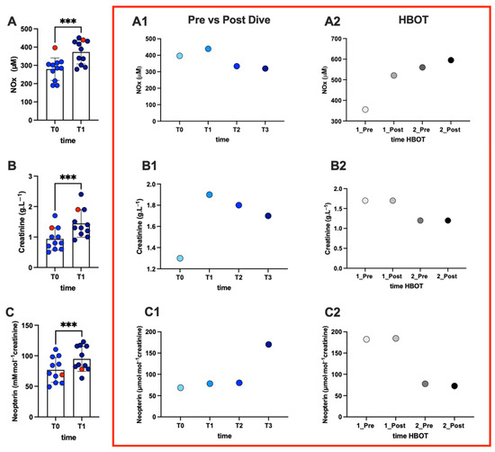 Panel plots of NO metabolites and renal status in divers and the evolution of concentration in the DCS-affected subject. Histogram plot of urinary (A) NO metabolites, (B) creatinine, and (C) neopterin concentration in all divers pre- and post-immersion. The red dot indicates the subject of the DCS case. Statistically significant differences comparisons are displayed as follows: ***, p < 0. 001. At the right panel, inside the red box, the time course of (A1,A2) NOx, (B1,B2) creatinine, and (C1,C2) neopterin from T0 to T3 (T0: 30 min before the dive; T1: 30 min after surfacing and DCS symptom onset; T2: 3 h after DCS symptom onset; T3: 6 h after DCS symptom onset), and in the two HBOT sessions in the injured subject.