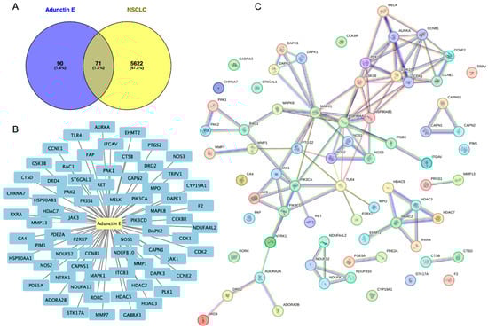 Molecular target identification of adunctin E. (A) This Venn diagram represents targets of adunctin E (blue), targets in non-small cell lung cancer (NSCLC, yellow), and common targets between the compound and the disease. (B) A compound–target network was constructed by Cytoscape 3.9. Active components were labeled in yellow, whereas the 71 common targets were highlighted in blue. (C) The protein–protein interaction (PPI) network of the common targets was analyzed by importing 71 common targets to the search tool from the STRING.