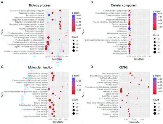 Gene ontology (GO) and Kyoto Encyclopedia of Genes and Genomes (KEGG) pathway enrichment analyses were conducted on the potential targets of adunctin E in non-small cell lung cancer (NSCLC). Data analyzed in STRING were imported to RStudio with the ggplot2 package. The GO terms examined include (A) biological process, (B) cellular component, and (C) molecular function. (D) The KEGG pathway associated with these common targets was analyzed.