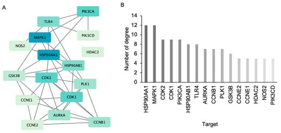 The common target network obtained from STRING was imported into Cytoscape (Figure 4A), and the topology analysis highlighted the top 16 molecules based on their degree of connectivity (Figure 4B and Table S4). These molecules, appearing dark to light green according to their degree scores, are potential targets of AE in NSCLC. Among the identified targets, the key regulators implicated in NSCLC pathogenesis included HSP90AA1, MAPK1, CDK2, cyclin-dependent kinase 1 (CDK1), phosphatidylinositol-4,5-bisphosphate 3-kinase catalytic subunit alpha (PIK3CA), heat shock protein 90 alpha family class B member 1 (HSP90AB1), toll-like receptor 4 (TLR4), aurora kinase A (AURKA), cyclin B1 (CCNB1), polo-like kinase 1 (PLK1), glycogen synthase kinase 3 beta (GSK3B), cyclin E2 (CCNE2), cyclin E1 (CCNE1), histone deacetylase 2 (HDAC2), nitric oxide synthase 2 (NOS2), and phosphatidylinositol-4,5-bisphosphate 3-kinase catalytic subunit delta (PIK3CD).