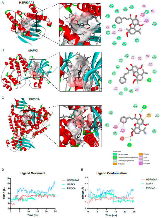 Molecular docking and molecular dynamics between adunctin E and protein targets: 2D and 3D interactions between adunctin E and HSP90AA1 (A), MAPK1 (B), and PIK3CA (C). Root mean square deviation for ligand movement (D) and ligand conformation (E). Simulation between 22 adunctin E and HSP90AA1 (red), MAPK1 (green), and PIK3CA (blue) for 25 ns were plotted.