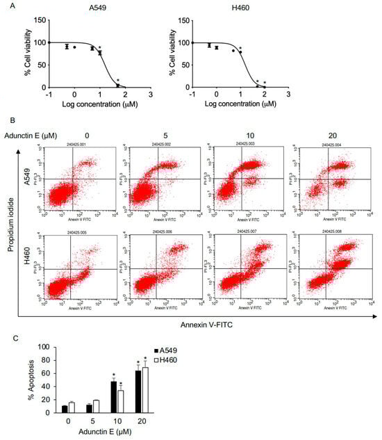In vitro cytotoxicity and apoptosis induction of adunctin E. (A) A549 and H460 cells were treated with adunctin E (0–100 μM) for 48 h. Cell viability was determined by MTT assay. Plots are presented as a percentage of cell viability. (B) Apoptosis cells were evaluated by annexin-V/propidium iodide (PI) staining. Representative histograms from the flow cytometry analysis are shown. (C) The number of early (annexin-V+, PI–) and late (annexin-V+, PI+) apoptotic cells were plotted. Data are presented as the mean ± SEM (n = 3). * p < 0.05 vs. untreated control cells.