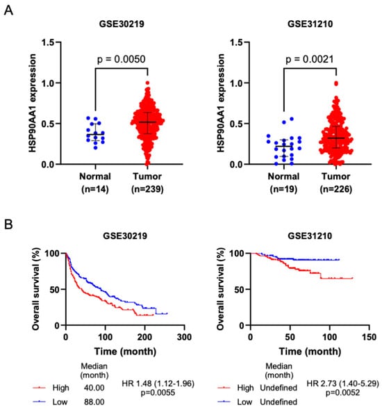 mRNA expression data were obtained from the Gene Expression Omnibus (GEO) database [54]. Two GEO datasets, namely, GSE30219 (tumors, n = 239; normal lung tissues, n = 14) and GSE31210 (tumors, n = 226; normal lung tissues, n = 19), were analyzed. The expression levels of HSP90AA1 in normal and tumor lung tissues were compared.