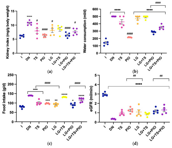 The PIO and LG + PIO groups saw improved KI, water and food intake, and eGFR in rats with DN. (a) PIO and LG + PIO restored renal index levels; (b) PIO, LG + PIO, and LG + TS + PIO reduced polydipsia in diabetic rats; (c) all treatments except LG + TS reduced polyphagia in DN rats; (d) all treatments increased eGFR levels. I; DN; TS; PIO; LG; LG + TS; LG + PIO; LG + TS + PIO. Data are presented as mean ± standard error of mean; n = 5. * p < 0.05 vs. I group, ** p < 0.01 vs. I group, *** p < 0.001 vs. I group, **** p < 0.0001 vs. I group, # p < 0.05 vs. DN group, ## p < 0.01 vs. DN group, #### p < 0.0001 vs. DN group.