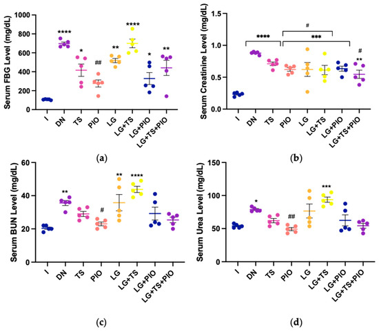 Creatinine levels improved in the TS (58.17 mg/dL; p < 0.01), PIO (69.08 mg/dL; p < 0.0001), LG (59.89 mg/dL; p < 0.001), LG + PIO (58.84 mg/dL; p < 0.001), and LG + TS + PIO (51.32 mg/dL; p < 0.05) groups. The LG + TS group (11.33 mg/dL) had a lower concentration than even the DN group (35.42 mg/dL).