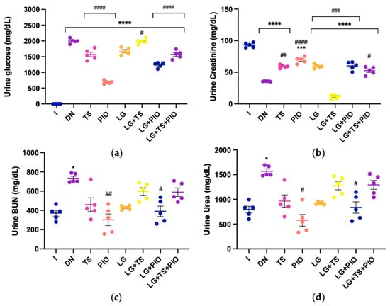 The concentrations of glucose, creatinine, BUN, and urea in the urine of different treated rat groups are shown in Figure 3. The DN group had a glucose concentration of 1995.37 mg/dL, which was higher than the healthy control (I). In the TS (1433.33 mg/dL; p < 0.0001), PIO (733.33 mg/dL; p < 0.0001), and LG (1633.33 mg/dL) groups, the PIO group reduced glucose concentration by up to 50% compared to the DN group. Among the combination treatments, only the LG + PIO group (1225 mg/dL; p < 0.0001) showed a significant reduction.