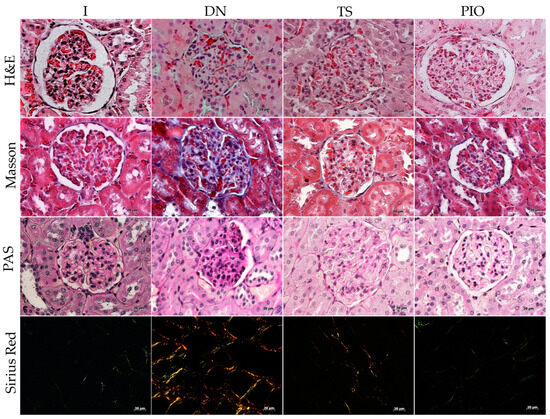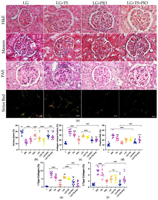 Hematoxylin–eosin (H&E) staining was performed to evaluate tissue damage, and Masson’s trichrome and Sirius red staining were used to visualize the collagen fibers. The healthy control group (I) showed no abnormal changes in renal histopathology. The DN group induced with STZ exhibited reduced urinary space (12.57%; p < 0.0001), increased mesangial expansion, glomerular hypertrophy, focal and segmental glomerulosclerosis characterized by collagen I deposition (36.73%; p < 0.0001), GBM thickening (29.53%; p < 0.0001), tubulointerstitial fibrosis (COL I, 8.01% and COL III, 5.36%; p < 0.0001), and glomerular alteration. The TS group showed less glomerular hypertrophy, and a larger urinary space (15.94%) compared to the DN group, along with reduced collagen I in the glomerulus (30.50%; p < 0.001) and GBM (22.84%; p < 0.001), as well as collagen I in the tubulointerstitial area (COL-I, 5.93% and COL-III, 4.39%; p < 0.01). In the PIO and LG groups, there was a recovery of normal glomerular and tubulointerstitial structure, with an increase in urinary space (24.46%; p < 0.0001 and 18.66%; p < 0.05, respectively), reduced collagen I in the glomerular area (18.99% and 27.95%; p < 0.0001, respectively) and GBM (14.48% and 20.26%; p < 0.0001, respectively), as well as decreased collagen I and III in the tubulointerstitial area (PIO: COL I, 1.65%; p < 0.0001, COL III, 2.07%; p < 0.0001 and LG: COL I, 5.89%; p < 0.01, COL III, 2.72%; p < 0.0001). Regarding the combination of drugs, the LG + TS, LG + PIO, and LG + TS + PIO groups showed results similar to the PIO and LG groups: urinary space (15.27%, 22.75%, p < 0.0001, 21.87%, p < 0.0001, respectively), collagen I in the glomerular area (25.72%, p < 0.0001, 19.37%, p < 0.0001, 19.89%, p < 0.0001, respectively), GBM (20.69%, p < 0.0001, 15.74%, 21.22%, p < 0.0001, respectively), and collagen I and III (COL I, 5.14%, p < 0.0001, COL I, 2.84%, p < 0.0001, COL I, 2.04%, p < 0.0001, respectively, and COL III, 2.86%, p < 0.0001, COL III, 1.61%, p < 0.0001, COL III, 2.51%, p < 0.0001, respectively).