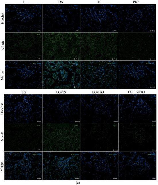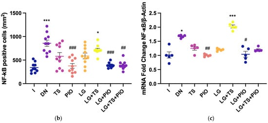 The immunofluorescence and gene expression of NF-κB. (a) The PIO, LG + PIO, and LG + TS + PIO groups saw reduced NF-κB positivity in DN rats (×200) (calibration bar = 50 μm); (b) morphometric analysis of the number of positive cells per square millimeter, 2 fields per slide were analyzed; (c) the relative gene expression of NF-κB mRNA. I; DN; TS; PIO; LG; LG + TS; LG + PIO; LG + TS + PIO. Data are presented as mean ± standard error of mean; n = 5. * p < 0.05 vs. I group, *** p < 0.001 vs. I group, # p < 0.05 vs. DN group, ## p < 0.01 vs. DN group, ### p < 0.001 vs. DN group.