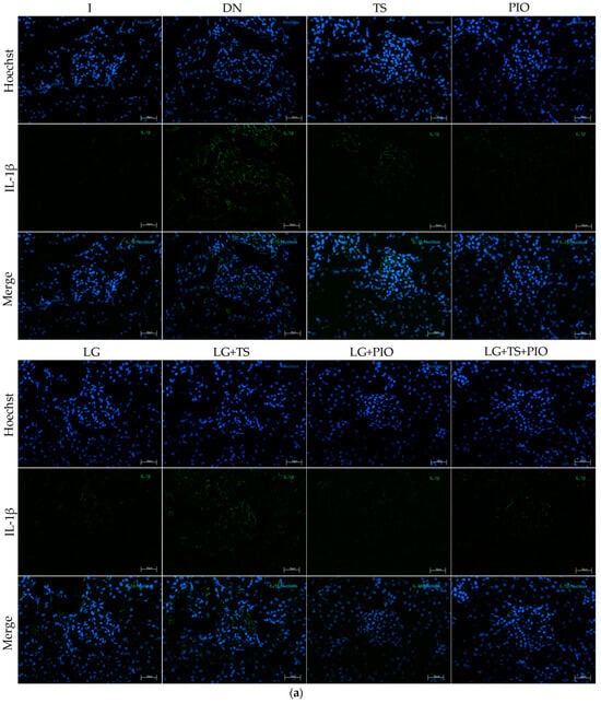 Thus, immunofluorescence and qPCR analyses were performed on three factors: NF-κB, IL-1β, and IL-10. Regarding the first inflammatory parameter, immunofluorescence revealed a significant increase in the number of NF-κB-positive cells in the DN group compared to the control group (I), suggesting increased inflammation in the diabetic model. Additionally, the PIO, LG + PIO, and LG + TS + PIO groups showed a significant decrease compared to the DN group, as well as a significant reduction in NF-κB mRNA expression in the PIO and LG + PIO groups. However, the other groups also showed non-significant reductions, except for the LG + TS group, which showed no effect. Furthermore, regarding IL-1β, the administration of tamsulosin, pioglitazone, and linagliptin, as well as their combinations LG + TS, LG + PIO, and LG + TS + PIO, showed significant reductions compared to the diabetic group. Finally, the number of IL-10-positive cells and its gene expression revealed significant decreases in the number of IL-10-positive cells in the DN group due to a lack of anti-inflammatory response caused by DN. This expression was partially recovered by the PIO, LG + PIO, and LG + TS + PIO groups. Additionally, gene expression showed positive regulation by the administration of tamsulosin, pioglitazone, and linagliptin, as well as their combinations LG + TS, LG + PIO, and LG + TS + PIO.