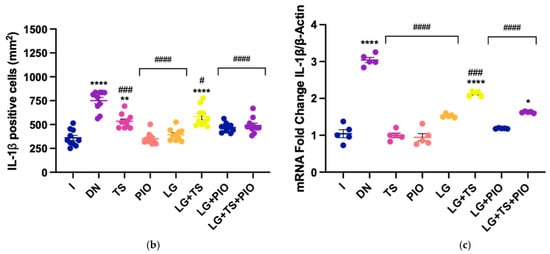 The immunofluorescence and gene expression of IL-1β. (a) The PIO and LG + PIO groups saw reduced IL-1β positivity in DN rats (X200) (calibration bar = 50 μm); (b) morphometric analysis of the number of positive cells per square millimeter, 2 fields per slide were analyzed; (c) the relative gene expression of IL-1β mRNA. I; DN; TS; PIO; LG; LG + TS; LG + PIO; LG + TS + PIO. Data are presented as mean ± standard error of mean; n = 5. * p < 0.05 vs. I group, ** p < 0.01 vs. I group, **** p < 0.0001 vs. I group, # p < 0.05 vs. DN group, ### p < 0.001 vs. DN group, #### p < 0.0001 vs. DN group.