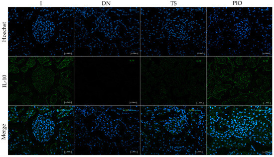 The anti-inflammatory effect of the different drugs used was evaluated by immunofluorescence and RT-qPCR. Immunofluorescence analysis showed a significant increase in NF-κB- and IL-1β-positive cells in the DN group (844.44 cells/mm2, p < 0.001, 735.24 cells/mm2, p < 0.0001) compared to the I group (352.68, 373.60 cells/mm2). All groups showed a reduction in the number of NF-κB- and IL-1β-positive cells. However, we saw that the PIO (387.05 cells/mm2, p < 0.001), LG + PIO (394.52 cells/mm2, p < 0.001), and LG + PIO + TS (404.98 cells/mm2, p < 0.01) groups had NF-κB-positive cells similar to the intact group (Figure 4). Regarding IL-1β, the PIO (363.14 cells/mm2, p < 0.0001), LG (397.51 cells/mm2, p < 0.0001), LG + PIO (479.7 cells/mm2, p < 0.0001), and LG + PIO + TS (494.64 cells/mm2, p < 0.0001) groups were similar to the intact group. On the other hand, when evaluating the presence of IL-10-positive cells, we observed that the DN group (665.99 cells/mm2, p < 0.0001) had lower values compared to the I group (1376.29 cells/mm2). The group treated with pioglitazone (1133.13 cells/mm2, p < 0.0001) showed a higher number of IL-10-positive cells than the groups treated with tamsulosin (855.15 cells/mm2) and linagliptin (897.16 cells/mm2), whether used alone or in combination. However, compared to the DN group, the LG + PIO (1024.13 cells/mm2, p < 0.001) and LG + PIO + TS (1022.94 cells/mm2, p < 0.001) groups also showed significant increases (Figure 5). To correlate these immunofluorescence observations, we analyzed the relative gene expression levels of these markers. The DN group exhibited a significant increase in NF-κB (1.67-fold, p < 0.05) and IL-1β (3.03-fold, p < 0.0001) but not in IL-10 (0.46-fold, p < 0.0001) compared to the control group (I) (1.04-fold, 1.03-fold, and 1.61-fold, respectively). Regarding the drugs, all groups except the LG + TS group showed lower expression levels of NF-κB and IL-1β (2.01-fold, p < 0.001, 2.13-fold, p < 0.001). Concerning IL-10, the drugs promoted the expression of this cytokine, with the PIO group (1.42-fold, p < 0.0001) showing a higher expression level compared to the DN group (0.46-fold) (Figure 6 and Figure 7).