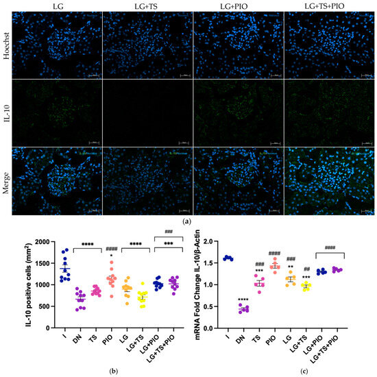 The immunofluorescence and gene expression of IL-10. (a) The PIO, LG + PIO, and LG + TS + PIO groups saw increased IL-10 positivity in DN rats (X200) (calibration bar = 50 μm); (b) morphometric analysis of the number of positive cells per square millimeter, 2 fields per slide were analyzed; (c) the relative gene expression of IL-10 mRNA. I; DN; TS; PIO; LG; LG + TS; LG + PIO; LG + TS + PIO. Data are presented as mean ± standard error of mean; n = 5. * p < 0.05 vs. I group, ** p < 0.01 vs. I group, *** p < 0.001 vs. I group, **** p < 0.0001 vs. I group, ## p < 0.01 vs. DN group, ### p < 0.001 vs. DN group, #### p < 0.0001 vs. DN group.
