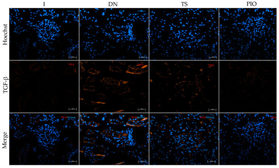 Urinary glucose has been documented as a marker of tubular dysfunction, and its analysis can be used to determine tubular damage in the progression of renal injury [89]. It is also a common parameter in patients with DM. In this study, the DN group showed high levels of urinary glucose compared to the I group. The drugs used were related to the FBG levels obtained, where those that reduced FBG levels also reduced urinary glucose levels (significant reductions in the TS, PIO, LG + TS, LG + PIO, and LG + TS + PIO groups), suggesting the tubular renoprotective role of these drugs.