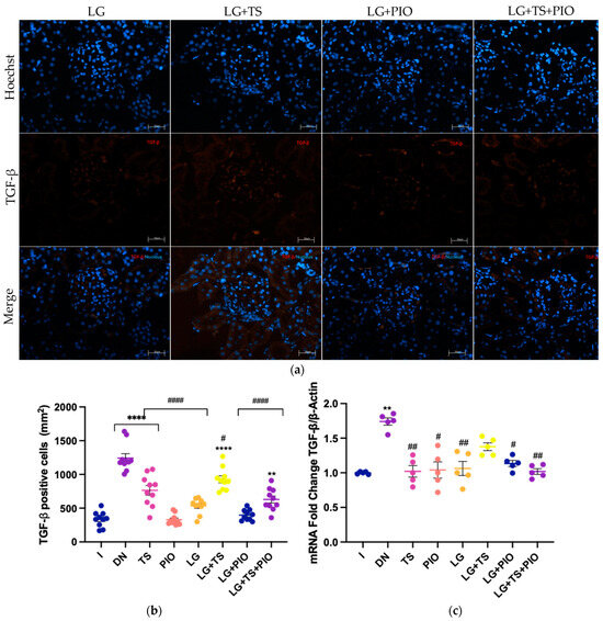 The immunofluorescence and gene expression of TGF-β. (a) The PIO and LG + PIO groups reduced TGF-β positivity in DN rats (×200) (calibration bar = 50 μm); (b) morphometric analysis of the number of positive cells per square millimeter, 2 fields per slide were analyzed; (c) the relative gene expression of TGF-β mRNA. I; DN; TS; PIO; LG; LG + TS; LG + PIO; LG + TS + PIO. Data are presented as mean ± standard error of mean; n = 5. ** p < 0.01 vs. I group, **** p < 0.0001 vs. I group, # p < 0.05 vs. DN group, ## p < 0.01 vs. DN group, #### p < 0.0001 vs. DN group.