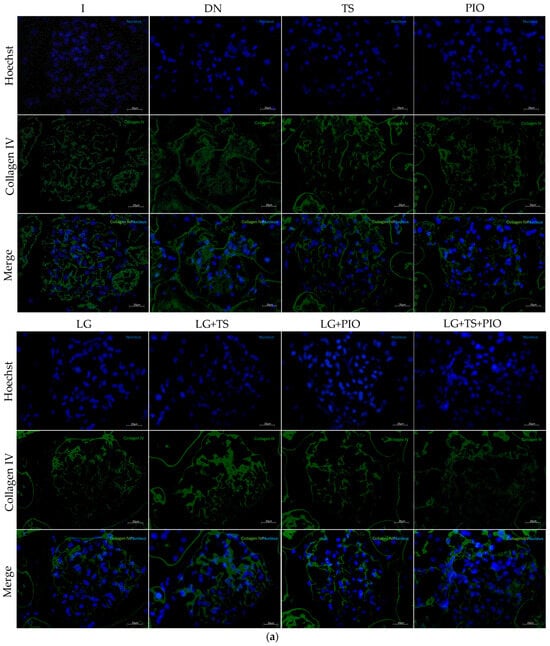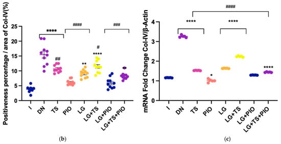 The immunofluorescence and gene expression of Col-IV. (a) The PIO, LG + PIO, and LG + TS + PIO groups saw a reduced percentage of Col-IV positivity in DN rats (X200) (calibration bar = 50 μm); (b) morphometric analysis of the Col-IV positive area, 2 fields per slide were analyzed; (c) relative gene expression of Col-IV mRNA. I; DN; TS; PIO; LG; LG + TS; LG + PIO; LG + TS + PIO. Data are presented as mean ± standard error of mean; n = 5. * p < 0.05 vs. I group, ** p < 0.01 vs. I group, **** p < 0.0001 vs. I group, # p < 0.05 vs. DN group, ## p < 0.01 vs. DN group, ### p < 0.001 vs. DN group, #### p < 0.0001 vs. DN group.