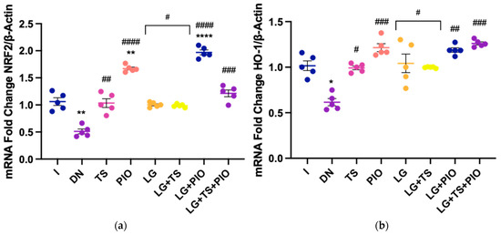 The gene expression of NRF2 and HO-1. (a) The PIO and LG + PIO groups saw stimulated NRF2 gene expression in DN rats; (b) the PIO, LG + PIO, and LG + TS + PIO groups saw stimulated HO-1 gene expression in DN rats. I; DN; TS; PIO; LG; LG + TS; LG + PIO; LG + TS + PIO. Data are presented as mean ± standard error of mean; n = 5. * p < 0.05 vs. I group, ** p < 0.01 vs. I group, **** p < 0.0001 vs. I group, # p < 0.05 vs. DN group, ## p < 0.01 vs. DN group, ### p < 0.001 vs. DN group, #### p < 0.0001 vs. DN group.