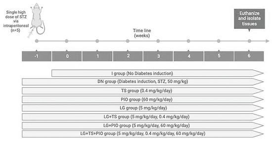 After a one-week acclimatization period, the DM induction protocol described by Furman et al. [63], with modifications, was followed. The rats were fasted for one day and then administered a single high dose of STZ (Sigma Aldrich Biotechnology, St. Louis, MO, USA) intraperitoneally (50 mg/kg), dissolved in a freshly prepared 0.1 mol/L citrate buffer solution at pH 4.5. Rats with fasting glucose levels greater than 13.9 mmol/L (250 mg/dL) [65], three days after the STZ injection were diagnosed as diabetic. The rats were randomly divided into 8 groups (n = 5): (I) the intact group (I); (II) the DN group or positive control, induced with STZ (DN); (III) the DN group treated with tamsulosin (diluted in purified water at a dose of 0.4 mg/kg, administered intragastrically, Pharmalife, Mexico, Mexico) (TS); (IV) the DN group treated with pioglitazone (diluted in 0.5% carboxymethylcellulose (CMC) at a dose of 60 mg/kg, administered intragastrically, Pharmalife, Jalisco, Mexico) (PG); (V) the DN group treated with linagliptin (diluted in purified water at a dose of 5 mg/kg, administered intragastrically, Boehringer Ingelheim, Mexico City, Mexico) (LG); (VI) the DN group treated with linagliptin and tamsulosin simultaneously (LG + TS); (VII) the DN group treated with linagliptin and pioglitazone simultaneously (LG + PG); (VIII) the DN group treated with linagliptin, tamsulosin, and pioglitazone simultaneously (LG + TS + PG). Weekly, the animals’ weight, water and food consumption, and fasting blood glucose (FBG) were measured using Accu-Chek, Performa (Figure 11).