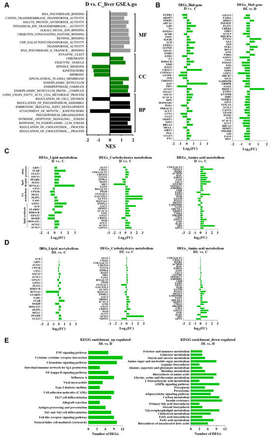 Effects of supplying lysine on hepatic transcriptome of dairy goats during late lactation. (A) GSEA analysis of DEGs from liver in D vs. C groups. MF in grey represents molecular function; CC in green represents cell component; BP in black represents biological process. (B) Hub genes from liver in D vs. C and DL vs. D groups. DEGs from liver in D vs. C (C) and DL vs. C (D) groups are involved in the lipid metabolism, carbohydrate metabolism, and amino acid metabolism. (E) KEGG analysis of the up-regulated and down-regulated DEGs from liver in DL vs. D groups. “C” represents the control group, namely protein-adequacy group; “D” represents the protein-deficient group; and “DL” represents the rumen-protected lysine (RPL)-supplemented protein-deficient group.