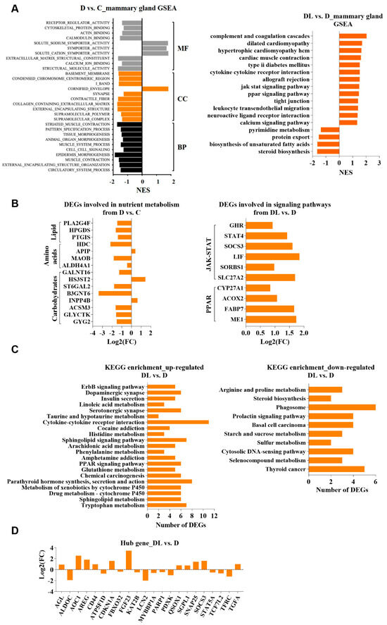 Effects of lysine supplementation on mammary gland transcriptome of dairy goats at late lactation. (A) GSEA analysis of DEGs from mammary glands in D vs. C and DL vs. D groups. (B) DEGs from mammary glands in D vs. C and DL vs. D groups are involved in the nutrient metabolism and signaling pathway. (C) KEGG analysis of the up-regulated and down-regulated DEGs from mammary glands in DL vs. D groups. (D) Hub genes from mammary glands in DL vs. D groups. “C” represents the control group, namely protein-adequacy group; “D” represents the protein-deficient group; and “DL” represents the rumen-protected-lysine-supplemented protein-deficient group.