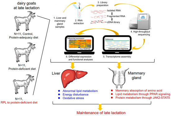 In conclusion, our study indicates that RPL supplementation of a low-protein diet contributes to sustaining milk production and health during late lactation primarily through several interconnected mechanisms (Figure 4). Firstly, in terms of energy compensation, RPL reduced energy disturbances by inhibiting hepatic lipogenesis and promoted mammary lipid metabolism via activating the PPAR signaling pathway. More importantly, in the presence of protein deficiency, RPL played a crucial role in promoting milk protein synthesis within the mammary glands through elevating mammary protein metabolism and activating the protein-synthesis-related pathway, such as the JAK–STAT signaling pathway, etc. Thus, in the context of protein deficiency, these comprised events in mammary protein and lipid metabolism as well as the normal hepatic function from RPL supplementationoccurred, which provide some valuable insights into the molecular mechanism by which lysine supplementation facilitates the maintenance of milk production during late lactation in other dairy ruminants lacking protein.