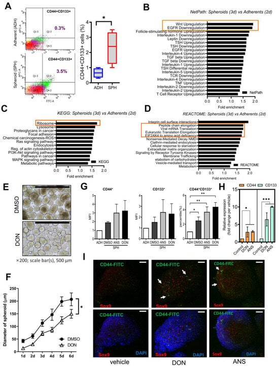 (A) Adherent (ADH) or spheroid (SPH) HCT-8 cells were stained for CD44 (FITC) and CD133 (APC) and quantified using the flow cytometer. Dots in a spectrum of colors represent the levels of cell clustering based on localization. The values in the upper right domains indicate levels of double-positive cancer cell population (%). Statistical analysis was conducted using data from four replicates, each consisting of 100 spheroids. Results are shown as a plot with Tukey whiskers, and asterisks (*) indicate significant differences between the two groups (* p < 0.05). (B) Based on the transcriptome analysis, NetPath analysis of human signaling transduction pathways from the manually curated resource was performed based on differentially expressed genes (DEGs) in spheroids compared with adherent HCT-8 cells. (C,D) Based on the transcriptome analysis, functional analyses of differentially expressed genes between spheroids (3D) vs. adherent HCT-8 cells (2D) were performed using KEGG (Kyoto Encyclopedia of Genes and Genomes, (C)) or REACTOME (D), which are initiative bioinformatic database tools of biological functionality and visualization pathways, respectively. Orange-colored squares indicate notable features as mentioned in the result. (E–I) HCT-8 cells were pre-exposed to 500 ng/mL of DON or 50 ng/mL of ANS, then cultured to form spheres for 6 days ((E), magnification, 40×; scale bars(s), 500 μm), and measured for the diameter of the spheroid with culture time (F). Asterisks represent statistically significant differences between the two groups based on the Wilcoxon rank sum test (* p < 0.05). (G) Mean fluorescence intensity (MFI) for CD44 and CD133 levels were measured in four replicates of 100 spheroids using flow cytometry analysis, and asterisks (*) indicate significant differences between the two groups (* p < 0.05, ** p < 0.01). (H) mRNA expression of CD133 and CD44 in HCT-8 spheroid cell population exposed to RIS and asterisks (*) indicate significant differences from each vehicle control group (* p < 0.05, *** p < 0.001). (I) Protein expression of CD44 and Sox9 in the HCT-8 spheroids using confocal microscopic Z-stacked images (the original magnification of 400×; scale bar(s), 50 μm). White arrows indicate CD44-positive cell clusters.