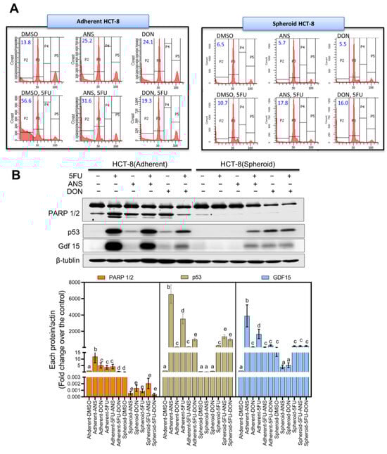 (A) Cell cycle analysis of adherent or spheroid HCT-8 cells as measured using propidium iodide (PI) by flow cytometry. Blue values indicate levels (%) of sub-Go population. (B) Adherent or spheroid cells were exposed to 500 ng/mL of DON or 50 ng/mL of ANS for 24 h and then treated with 5-FU (375 μM) for 48 h. The cell lysates were subjected to Western blot analysis. Different letters over each box represent statistically significant differences among groups based on one-way ANOVA (p < 0.05).