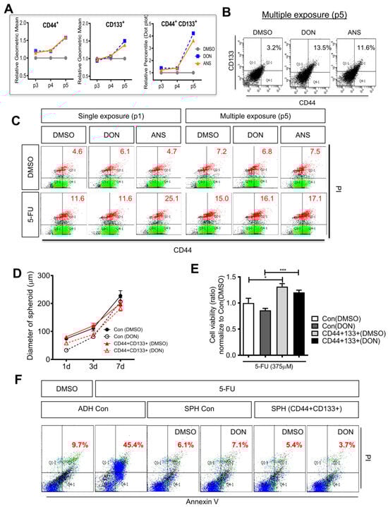(A) Cancer cell spheroids of each passage (a record of the number of times the culture has been sub-cultured after trypsinization) were measured for levels of CD44 and CD133 using flow cytometry assay. In each passage, cells were pre-exposed to 500 ng/mL DON or 50 ng/mL ANS for 24 h and further cultured for 6 days before subculture as indicated in the method. (B) Multiply RIS-exposed spheroids (passage 5, p5) were quantified for CD44 and CD133. (C) Spheroids single (p1) or multiply (p5) exposed to RIS (500 ng/mL DON or 50 ng/mL ANS) were treated with 5-FU (375 μM) for 48 h, and then measured for CD44 and Propidium Iodide (PI). Red values indicate the levels of CD44+ cells in the G2 phase. (D) Control and CD44+CD133+ spheroids were exposed to RIS (500 ng/mL DON) and then measured for the diameter with time. (E,F) Control and CD44+CD133+ spheroids were exposed to RIS (500 ng/mL DON) and then treated with 5-FU (375 μM) for 48 h. Cells were measured for their cell viability (E) and apoptosis (F). Asterisks represent statistically significant values (* p < 0.05, *** p < 0.001). The 5-FU treatment dose (375 μM) is a level required to inhibit the growth of adherent HCT-8 cells by approximately 50% while the spheroids display resistance. Red values indicate the early apoptosis levels as shown in the upper right domain. Dots in a spectrum of colors represent the levels of cell clustering based on localization.