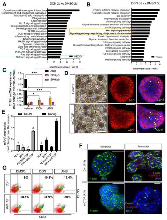 (A,B) KEGG analysis of DEGs in adherent HCT-8 cells (2D, (A)) and spheroids (3D, (B)) in response to RIS (DON) exposure. The orange-colored square indicates Wnt and stemness features, as described in the text. (C–E) Control and CTGF-deficient HCT-8 spheroids were measured for the morphology ((C), the original magnification of 40×; scale bar(s), 100 μm), protein expressions (D) of CD44, and activated beta-catenin (ABC) using the confocal microscopic analysis (the original magnification of 200×; scale bar(s), 100 μm), and mRNA expression (E). Arrows indicate CD44 cells in the spheroids (D). (F,G) Control and CTGF-deficient HCT-8 tumoroids were pre-exposed to RIS (500 ng/mL DON or 50 ng/mL ANS) and measured for CD44 and CD133. Quantitation was performed using the flow cytometry assay (G). Dots in a spectrum of colors represent the levels of cell clustering based on localization. The values in the upper right domain indicate levels of double-positive cancer cell population (%). The immune-stained HCT-8 cells were analyzed using confocal microscopy (the original magnification of 200×; scale bar(s), 100 μm, and 400×; scale bar(s), 50 μm for spheroids and tumoroids, respectively). Asterisks represent statistically significant values (* p < 0.05, *** p < 0.001). Different letters over each box represent statistically significant differences among groups based on one-way ANOVA (p < 0.05).