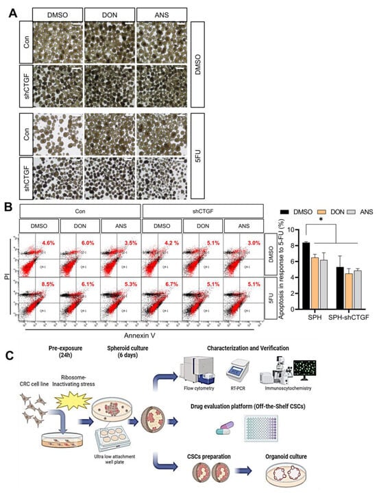 (A,B) Control and CTGF-deficient spheroids were pre-exposed to RIS (500 ng/mL DON or 50 ng/mL ANS) and then treated with 5-FU (375 μM) for 48 h. Tumor sphere formation (B) was observed. The microscopic analysis was performed at the original magnification of 40×; scale bar(s), 100 mm. Moreover, the apoptosis of spheroid cells (B) was measured using propidium iodide (PI) and annexin V in response to 5-FU. Red values indicate the early apoptosis levels in each treated spheroids in two replicates of 100 spheroids using flow cytometry analysis, and asterisks (*) indicate significant differences between the two groups (* p < 0.05). Dots in a spectrum of colors represent the levels of cell clustering based on localization. (C) Schematic overview of the off-the-shelf CSC platform of the anticancer drug efficacy and chemoresistance based on stress-induced cell reprogramming.