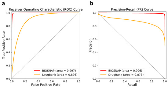 The left is (a) AUC-ROC curves, and the right is (b) PR-AUC curves of the BIOSNAP and DrugBank datasets. AUC-ROC curves are FPR on the x-axis and TPR on the y-axis, and the right shows the PR-AUC curves, in which the x-axis is the R and the y-axis is the P.