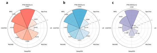 PTB-DDI test results in comparison with baselines based on the BIOSNAP dataset. (a) AUC-ROC, (b) PR-AUC, and (c) F1 score.