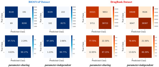 The performance of parameter-sharing and parameter-independent modes based on the BIOSNAP and DrugBank datasets are demonstrated by Table 1. Furthermore, the modes differ in the number and proportion of positive and negative predictions, which are illustrated in the confusion matrix and normalized confusion matrix of Figure 3. To ensure the robustness and accuracy of our results, we conducted three parallel experiments for both parameter-sharing and parameter-independent modes based on each dataset. The final confusion matrix represents the average of these results (Figures S1 and S2).